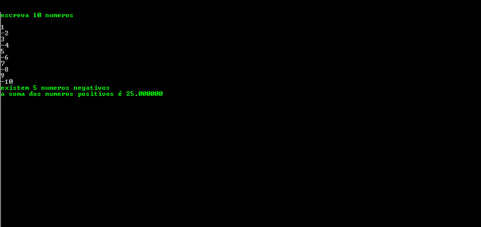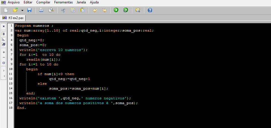 Código de um programa em pascal para dizer quantos nº negativos existem e qual a soma dos positivos.