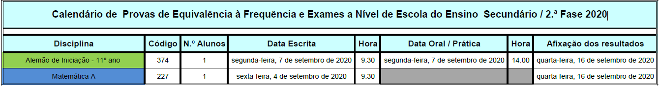 Calendário de Provas de Equivalência à Frequência e Exames a Nível de Escola do Ensino Secundário / 2ª Fase 2020